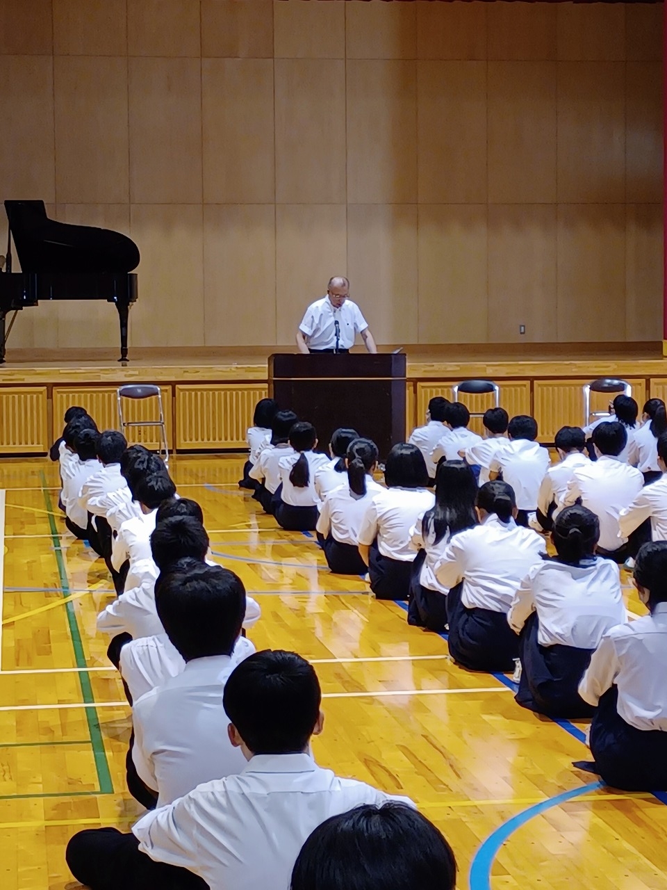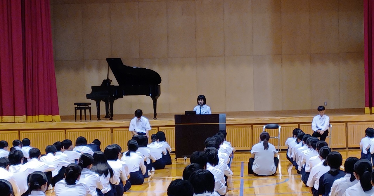 始業式では、各学年代表生徒による2学期の抱負の発表、校長先生のお話、校歌を斉唱しました。